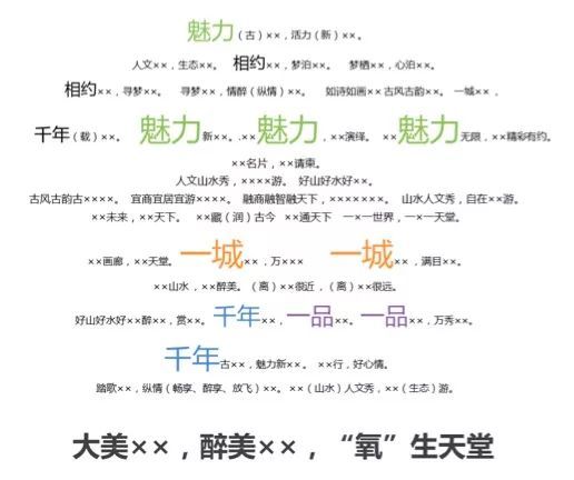 過去,我們在給國務(wù)院新聞辦做的全國宣傳片調(diào)研當(dāng)中,針對“全國旅游宣傳口號”時我們時候發(fā)現(xiàn),“大美”、“魅力”、“多彩”占據(jù)了60%以上。今年,當(dāng)我們重新整理城市旅游口號的時候,我們發(fā)現(xiàn)四字口號依然占比在43%,講“我有什么”的依然占比在52%。