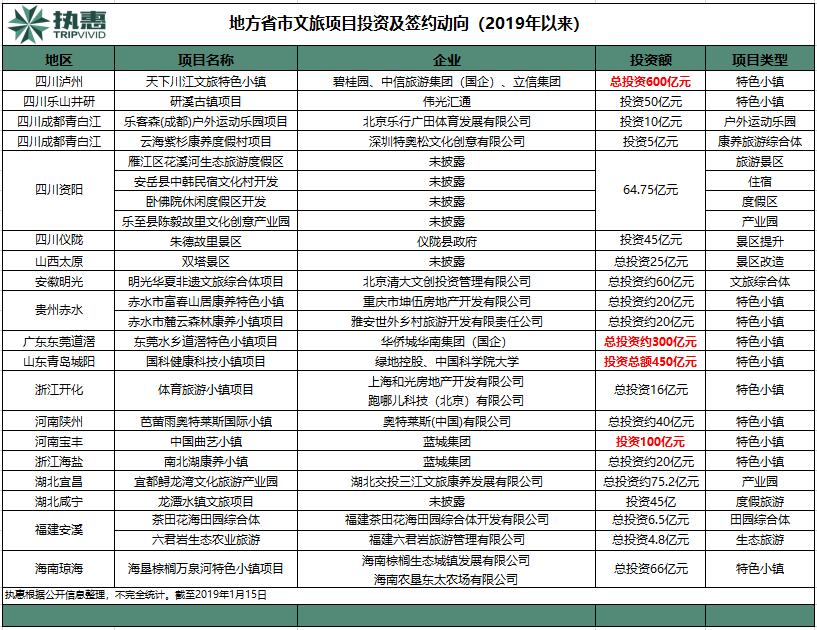 執(zhí)惠不完全統(tǒng)計(jì)顯示,2019年1月前半個(gè)月,各地方省市的文旅簽約投資概算總金額超過2000億元,涵蓋四川、山西、安徽、貴州、廣東、山東、浙江、河南、湖北、福建和海南等11個(gè)區(qū)域,涉20余個(gè)項(xiàng)目。