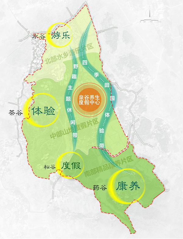 四組團(tuán):水谷游樂(lè)組團(tuán)、茶谷體驗(yàn)組團(tuán)、松谷度假組團(tuán)、藥谷康養(yǎng)組團(tuán)