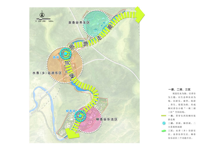 三區(qū):水香谷游樂區(qū)、泉香谷養(yǎng)生區(qū)、柳香谷樂活區(qū)三個功能片區(qū)。
