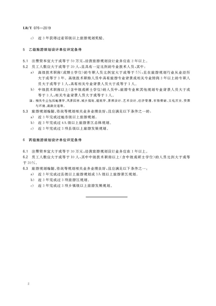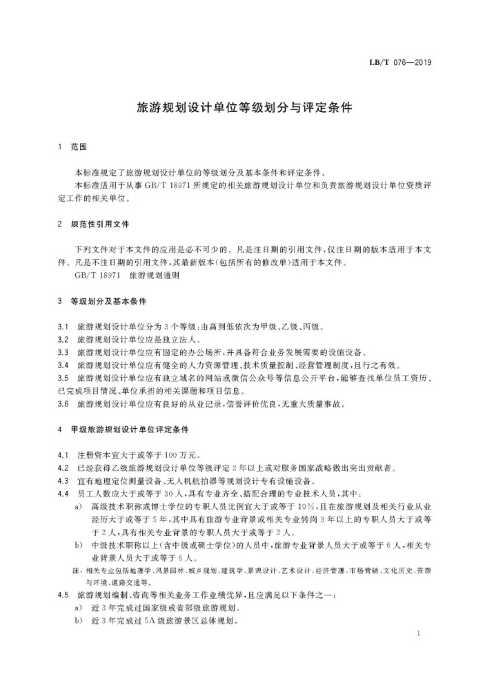 旅游行業(yè)標(biāo)準(zhǔn)《旅游規(guī)劃設(shè)計(jì)單位等級(jí)劃分與評(píng)定條件》(LB/T 076-2019)