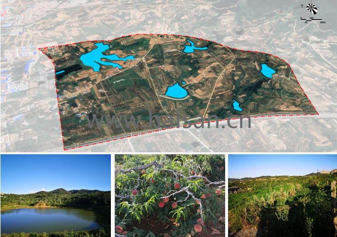 基地地形屬低山丘陵,形成了四丘三谷狀地形特征。谷盆中分布著五個(gè)大小不一的水庫,連接多條縱向溝壑,有較高起伏。植被多原始生態(tài),以果林(桃樹)為主,整體生態(tài)環(huán)境較好,視野開闊而局部幽隱