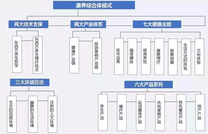 康養(yǎng)綜合體模式是一種以大健康產(chǎn)業(yè)與旅游度假產(chǎn)業(yè)雙輪驅(qū)動(dòng)的區(qū)域綜合開發(fā)模式。這一模式以東西方養(yǎng)生哲學(xué)與東西方養(yǎng)生理療技術(shù)為支撐,構(gòu)建健康產(chǎn)業(yè)鏈與旅游度假產(chǎn)業(yè)鏈兩大產(chǎn)業(yè)體系,打造延年益壽、強(qiáng)身健體、修身養(yǎng)性、康復(fù)理療、修復(fù)保健、生活方式體驗(yàn)、文化體驗(yàn)七大健康主題,形成區(qū)域健康的生活方式。